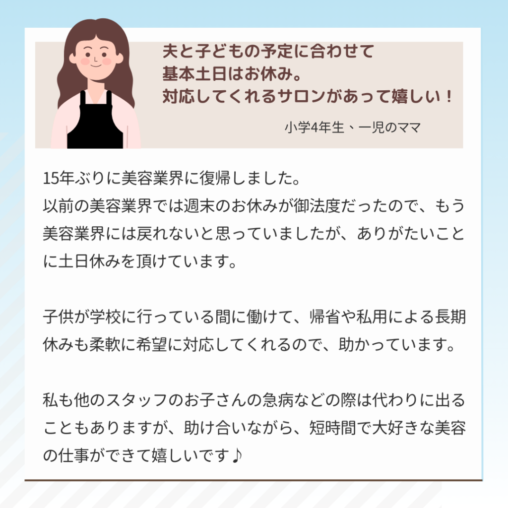 カラー専門店という入り口で美容師の道に戻り、国家資格を活かして資金的余裕を手に入れたい人。美容が好きだと実感する人。カラー専門店での勤務を通じて本当に好きなことを見つけ、自分の次の道を見つけて行く人。