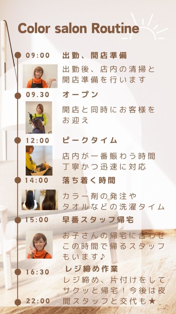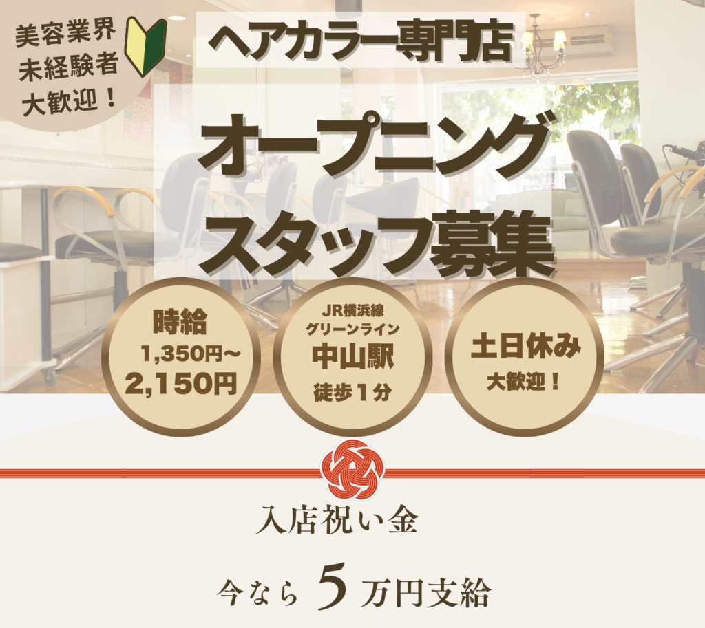 ・美容師免許をお持ちの方 ・未経験者歓迎 ・ブランクのある方も歓迎 ・カラー技術を学びたい方 |